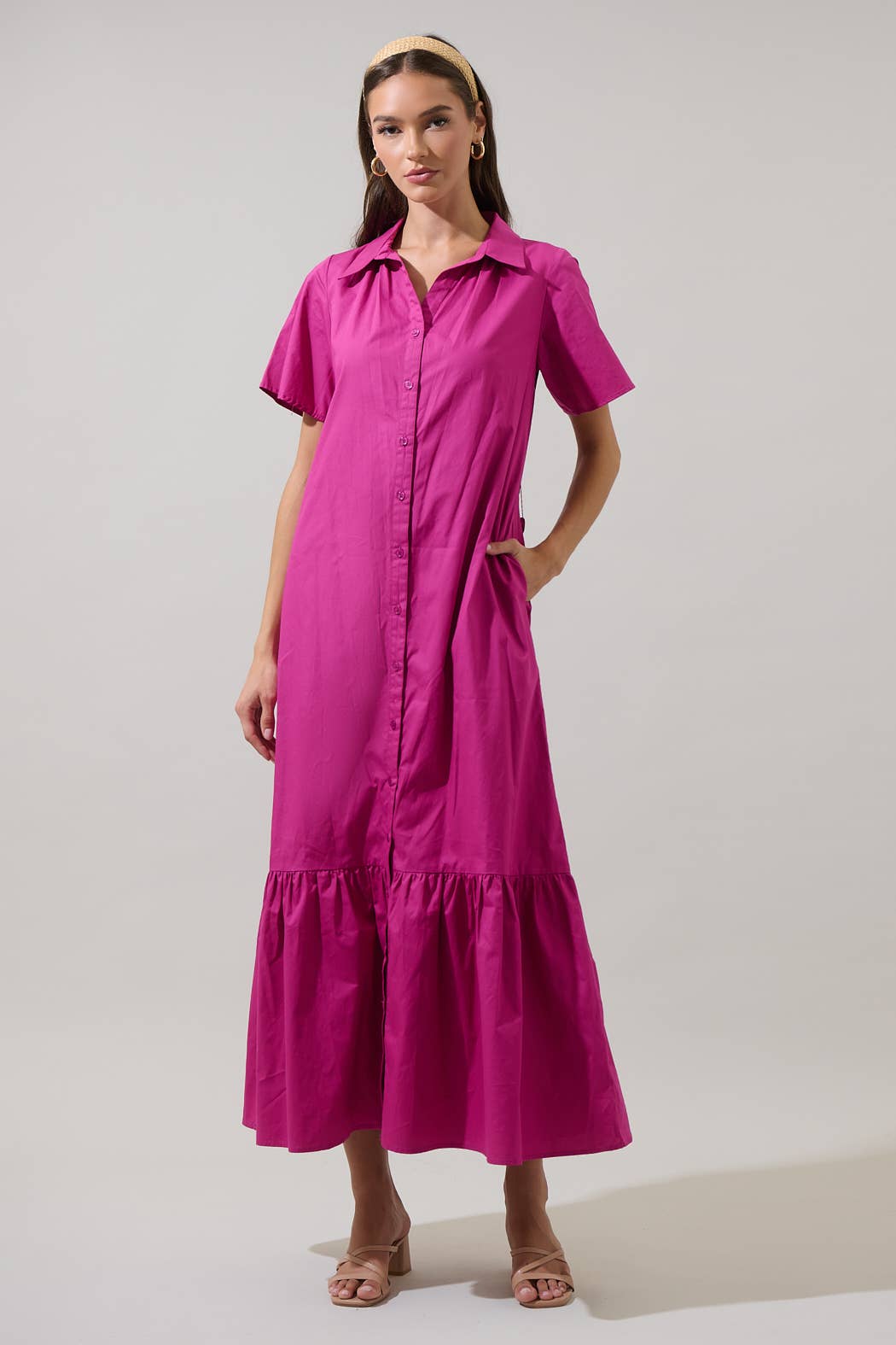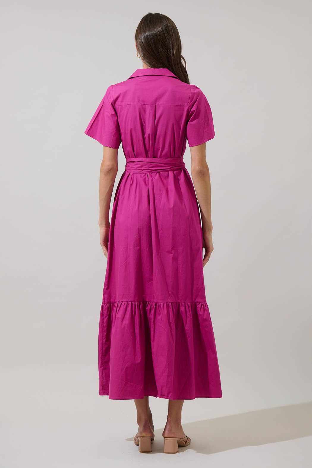 Your new go-to for effortless elegance. This button down maxi features short sleeves, a collared neck, and a waist tie to flatter your silhouette. Style it with heels and a woven tote for an easy, polished look.