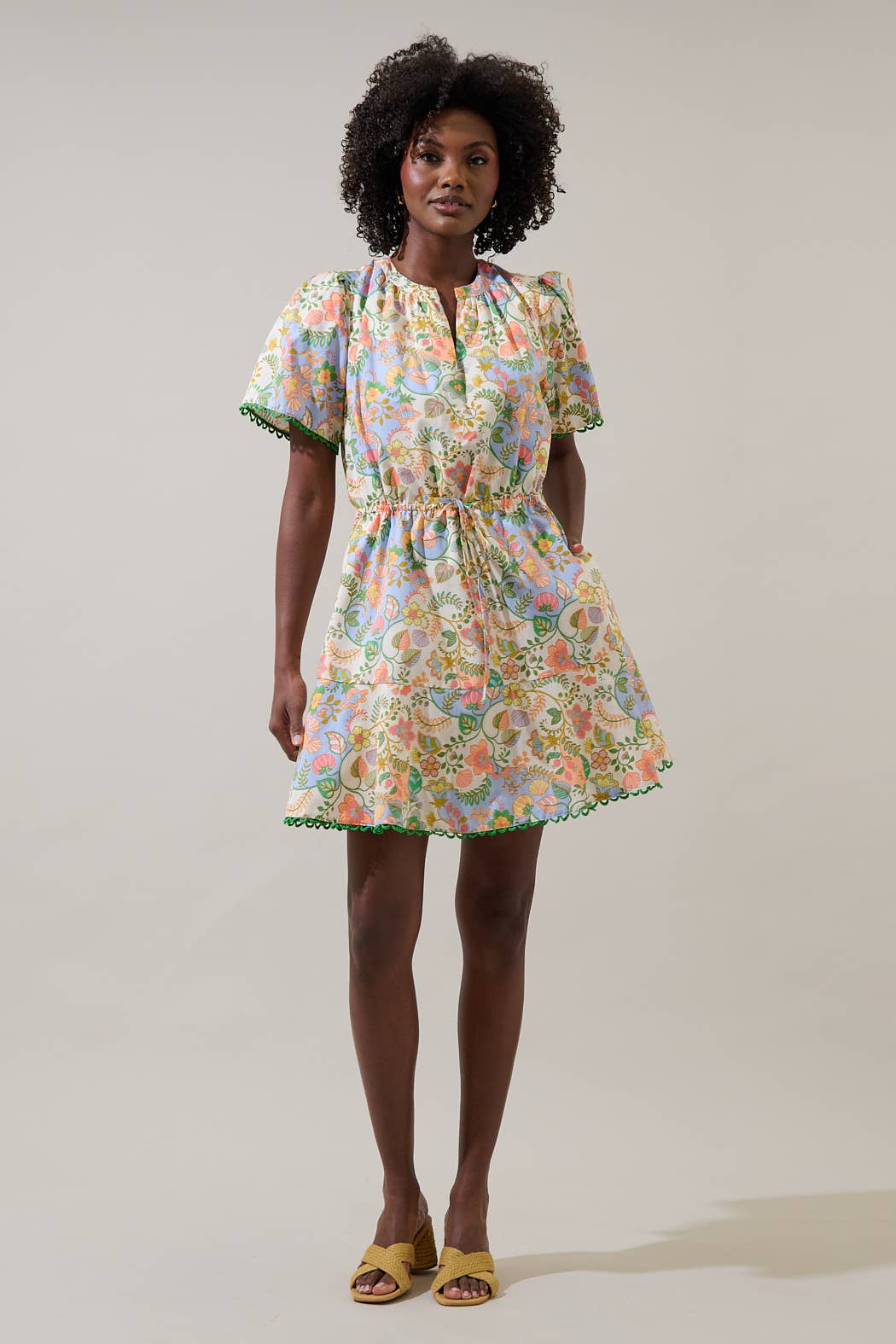 Receive lots of compliments when you wear this mini dress. Short sleeves with pleated shoulders frame a split neckline. The waist has a drawstring waist belt and ends at a mini hem. Pair the dress with white heels for a cute look.