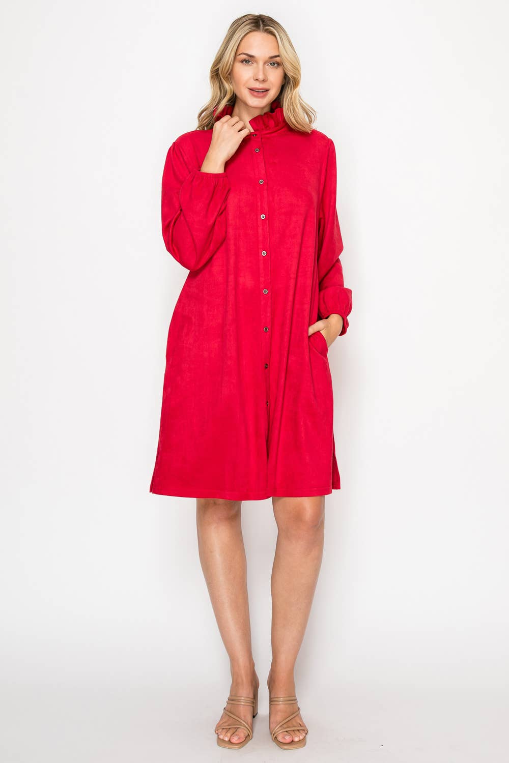 The Anthony dress. Stylish and comfort. Made with buttery soft stretch suede. Very high quality. Button front for closure. Mock neck with ruffle details. Long sleeves with gathering and elastic hems. Side pockets. Easy relax fit. Perfect for the fall season.