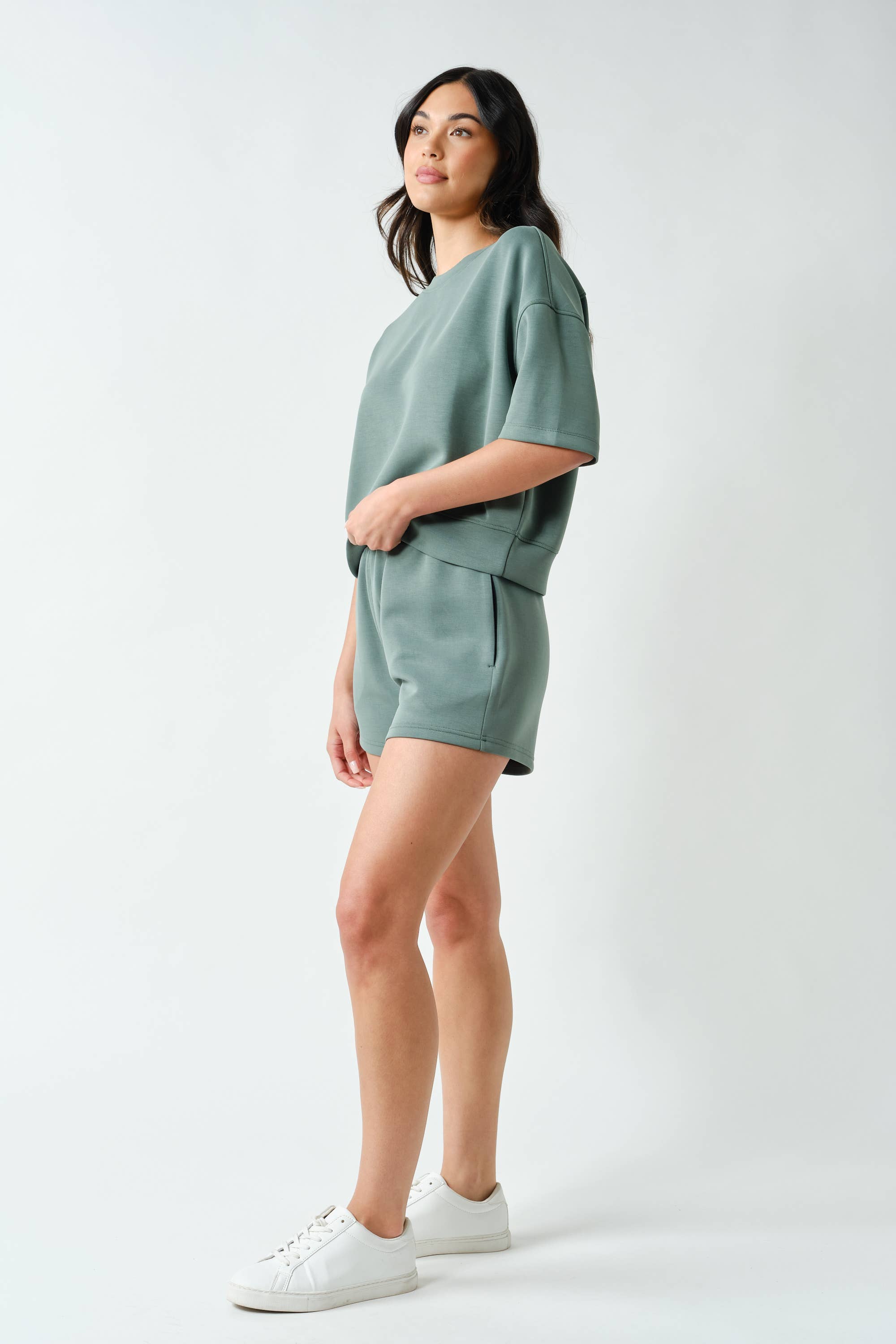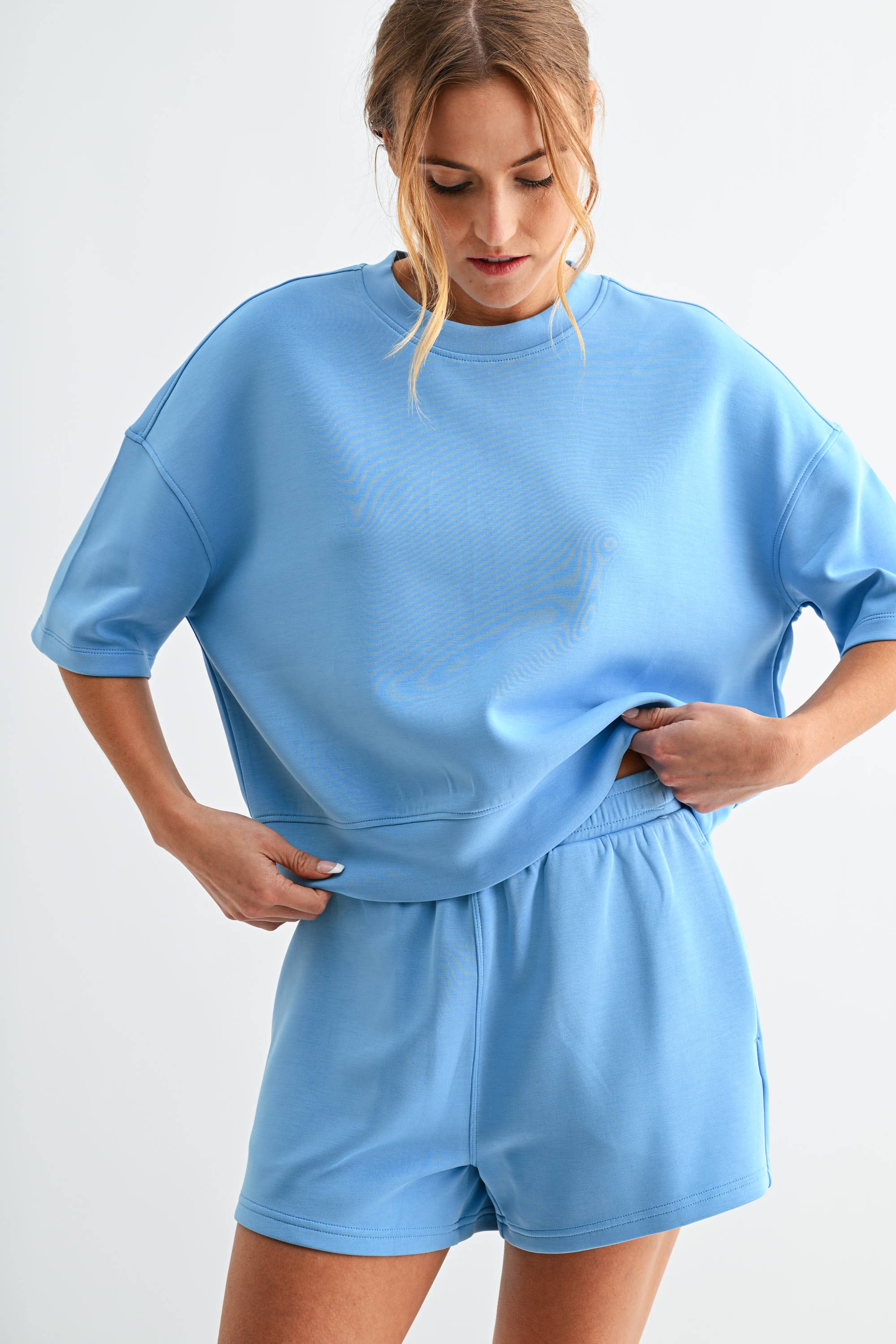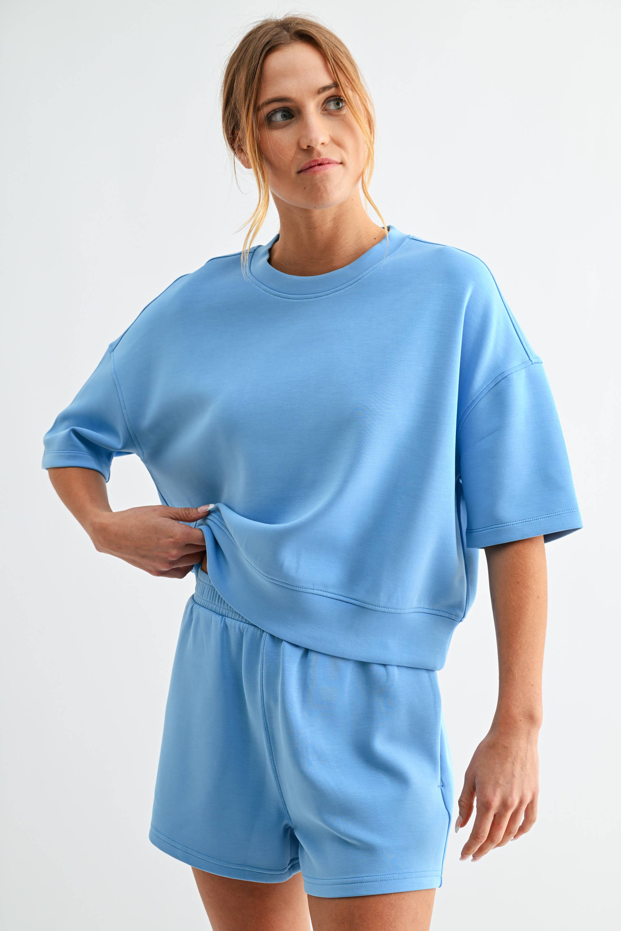 Meet your new go-to for effortless comfort — the Laguna Scuba Weekender Lounge Set. Made from our signature sand-washed scuba fabric with a buttery-soft, spongy hand feel, this matching tee and short duo features a relaxed, drop-shoulder silhouette with a slightly cropped fit. The shorts are designed with an elastic waistband and side pockets for an easy, laid-back look that feels as good as it looks.
