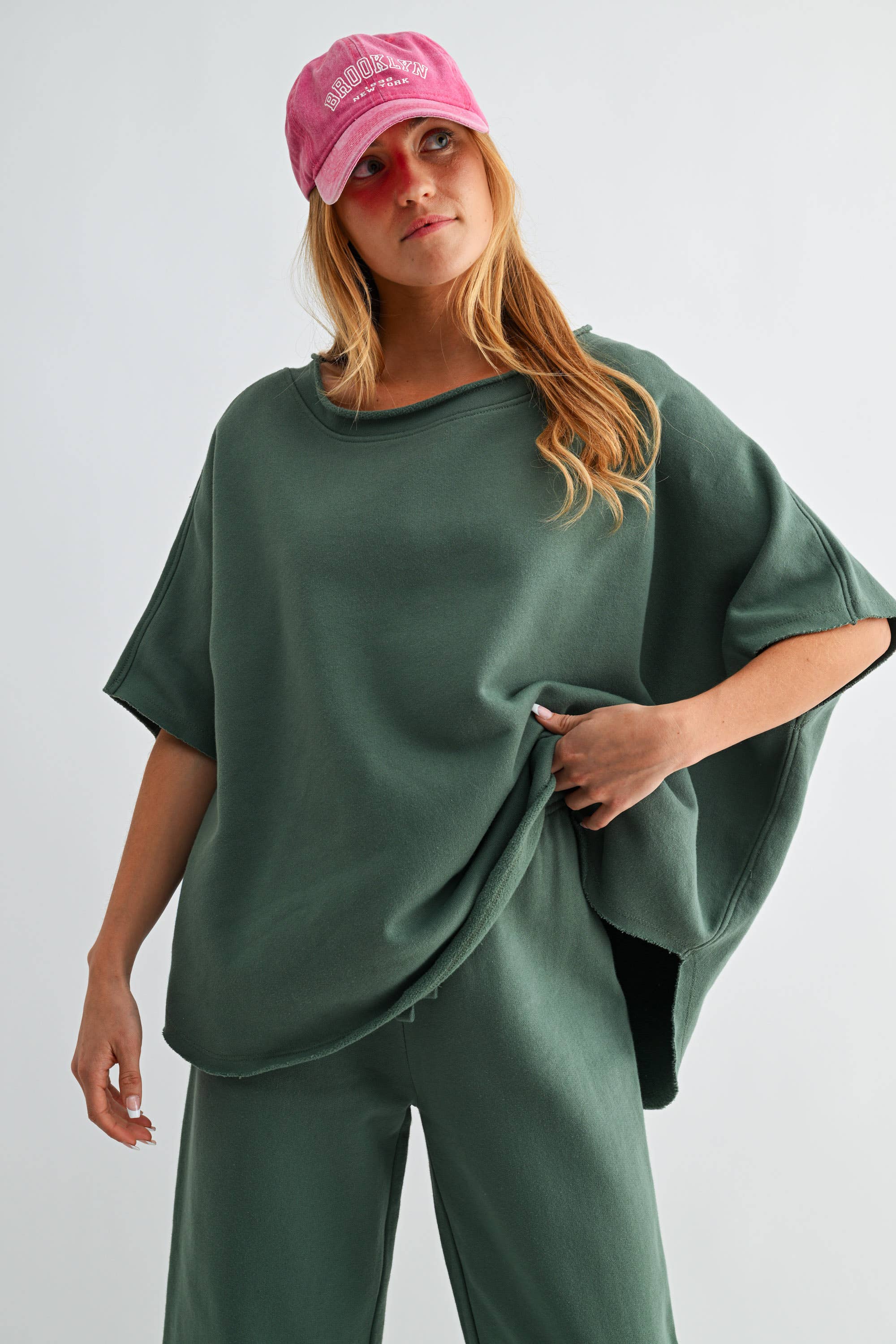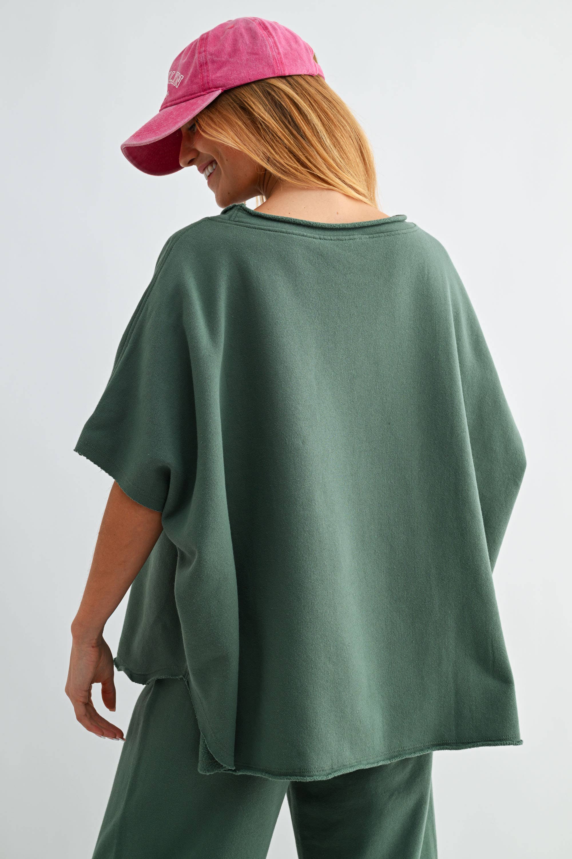Loose, comfortable dolman sleeve top with elbow-length sleeves and a raw hem for a vintage vibe. Made from 100% durable cotton, offering warmth and coverage. Slight boatneck design, perfect for spring. Garment-washed for a soft, unique feel. Easy to style.