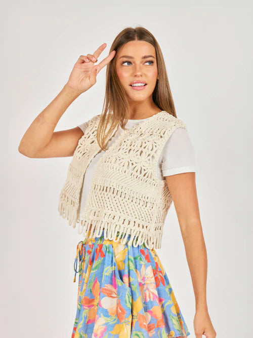 The Matilda Crochet Vest features an intricate, open-work design with a bohemian flair that adds a textured layer to your outifts. The macramé-inspired patterns and playful fringe hem create an effortless, handcrafted feel.