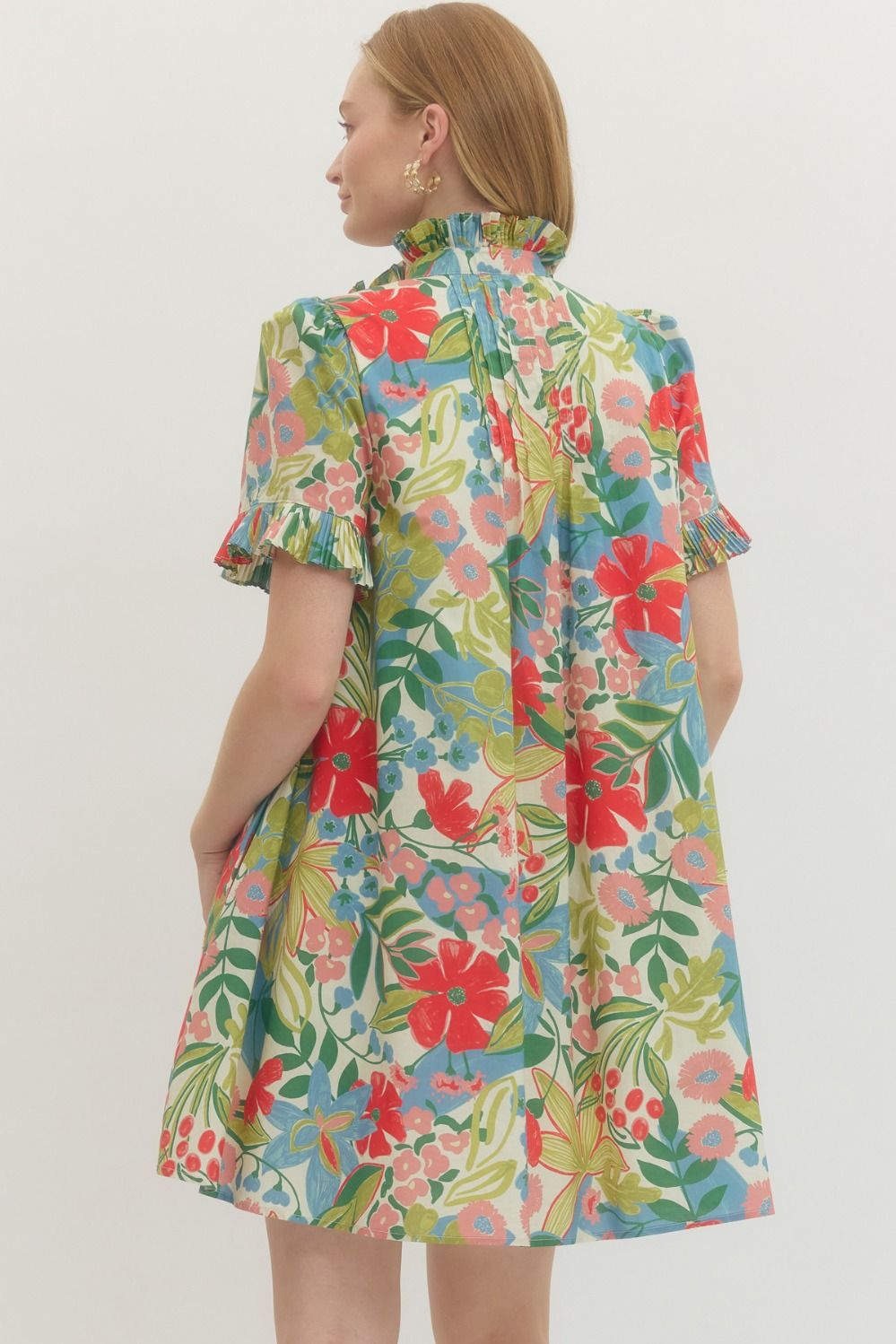 5'10" and wearing size SmallFloral print short sleeve mini dress featuring pleated ruffle trim at neckline and cuffs. Pintuck detail at front and back. Button closure at front. Side pockets. Lined. Woven. Non-sheer. Lightweight.