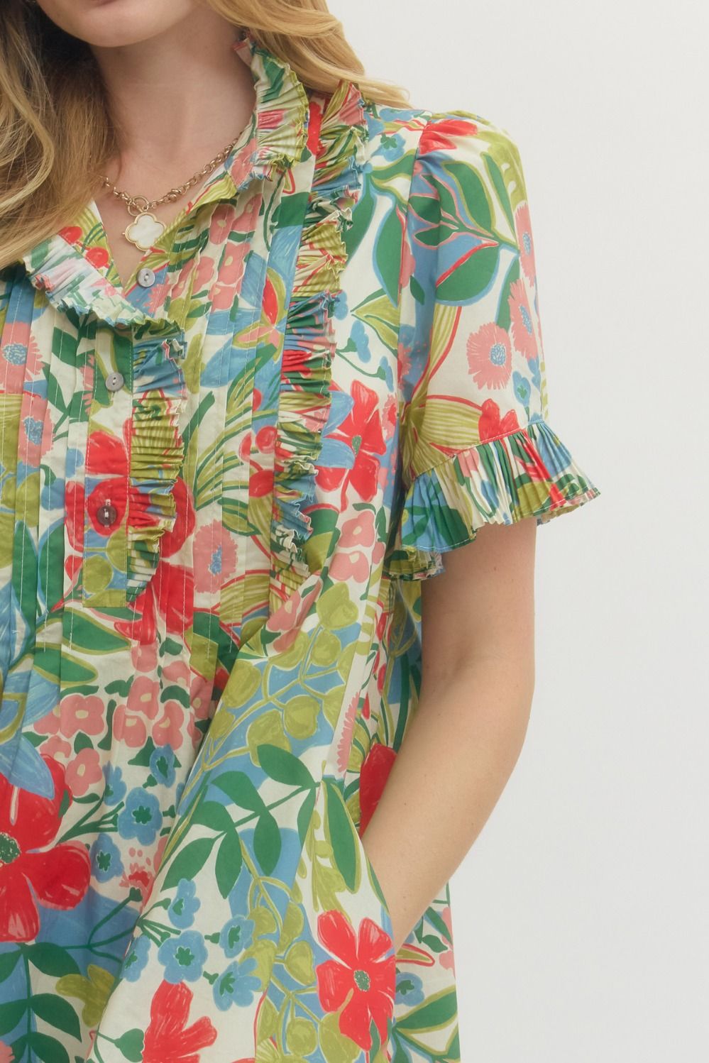 Floral print short sleeve mini dress featuring pleated ruffle trim at neckline and cuffs. Pintuck detail at front and back. Button closure at front. Side pockets. Lined. Woven. Non-sheer. Lightweight.