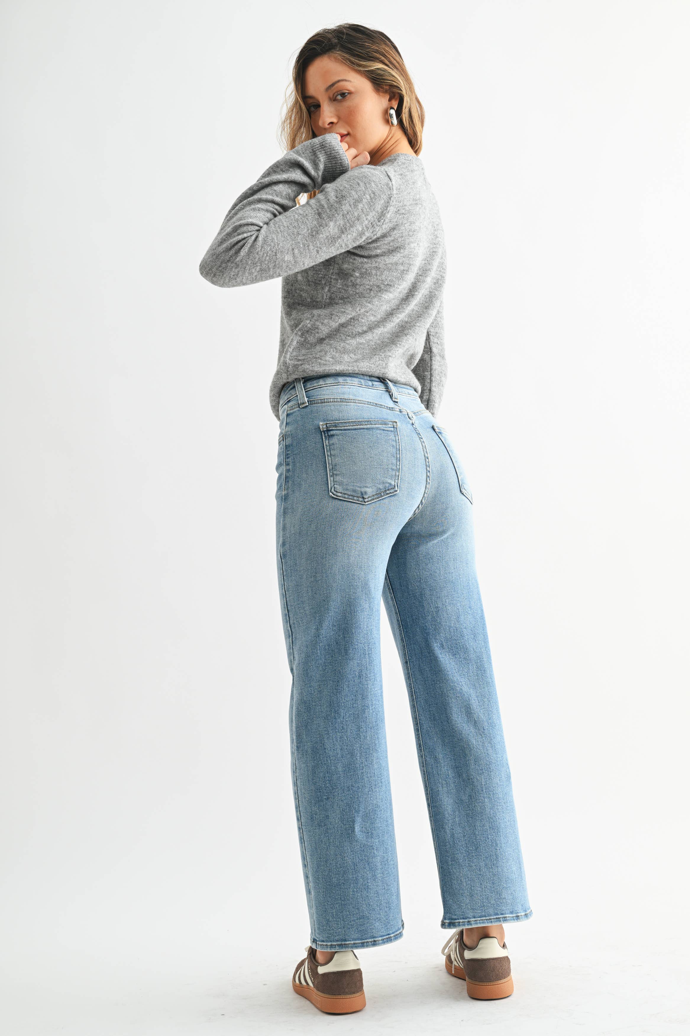 Back by popular demand, The Slim Wide Leg. These high-waisted jeans are slim through the waist and open up past the thigh. Plus these jeans are made with our ultra-soft and stretchy fabric, which is flattering on everyone.
