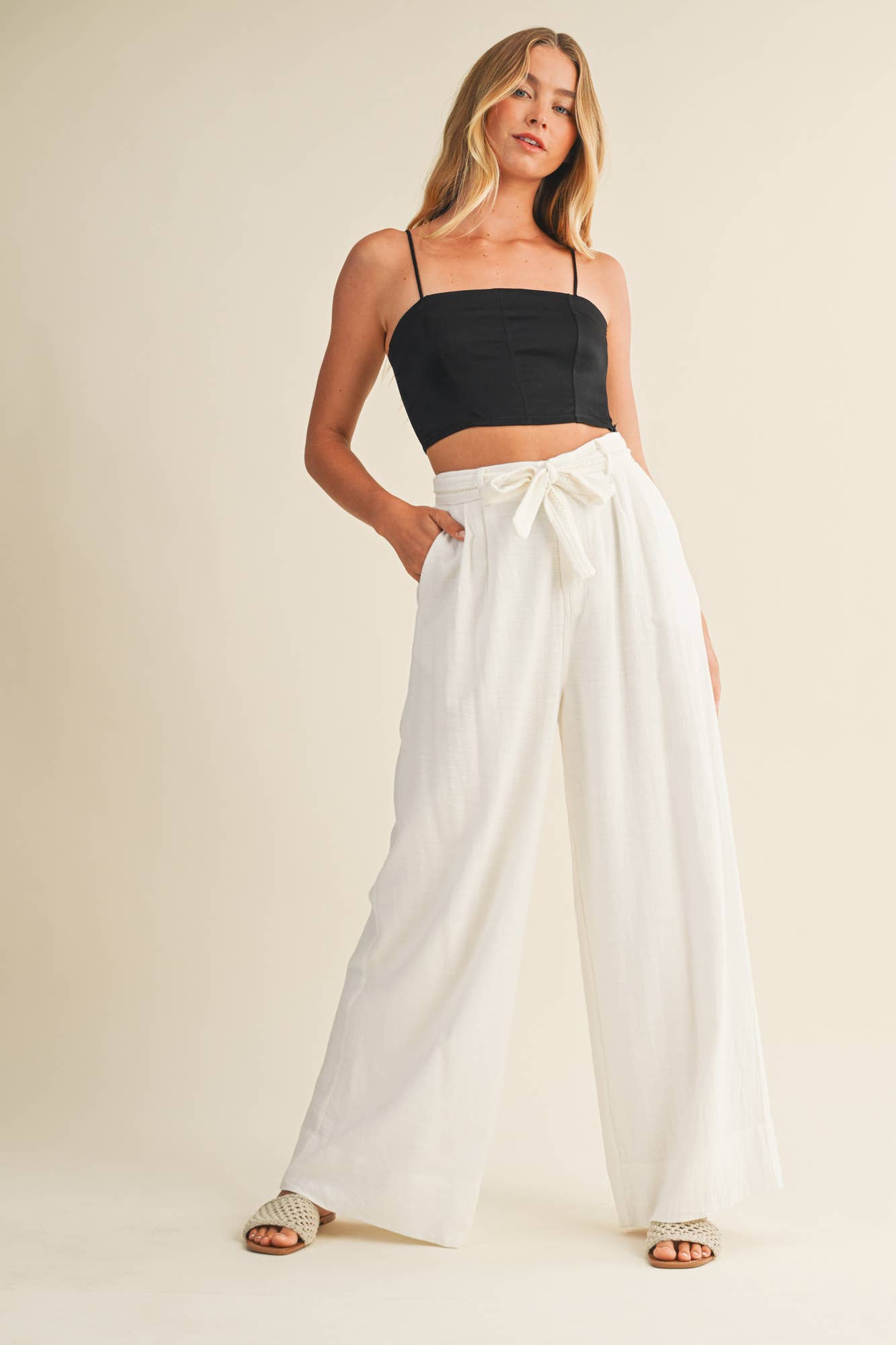 These linen trousers are your new warm-weather essential. The flowing wide-leg silhouette moves with you, while breathable linen keeps you cool through spring and summer days. Topped with a delicate lace-trimmed belt that adds a touch of feminine flair, they're perfect for everything from casual brunches to breezy evening strolls. Slip them on and feel the difference quality fabric makes.