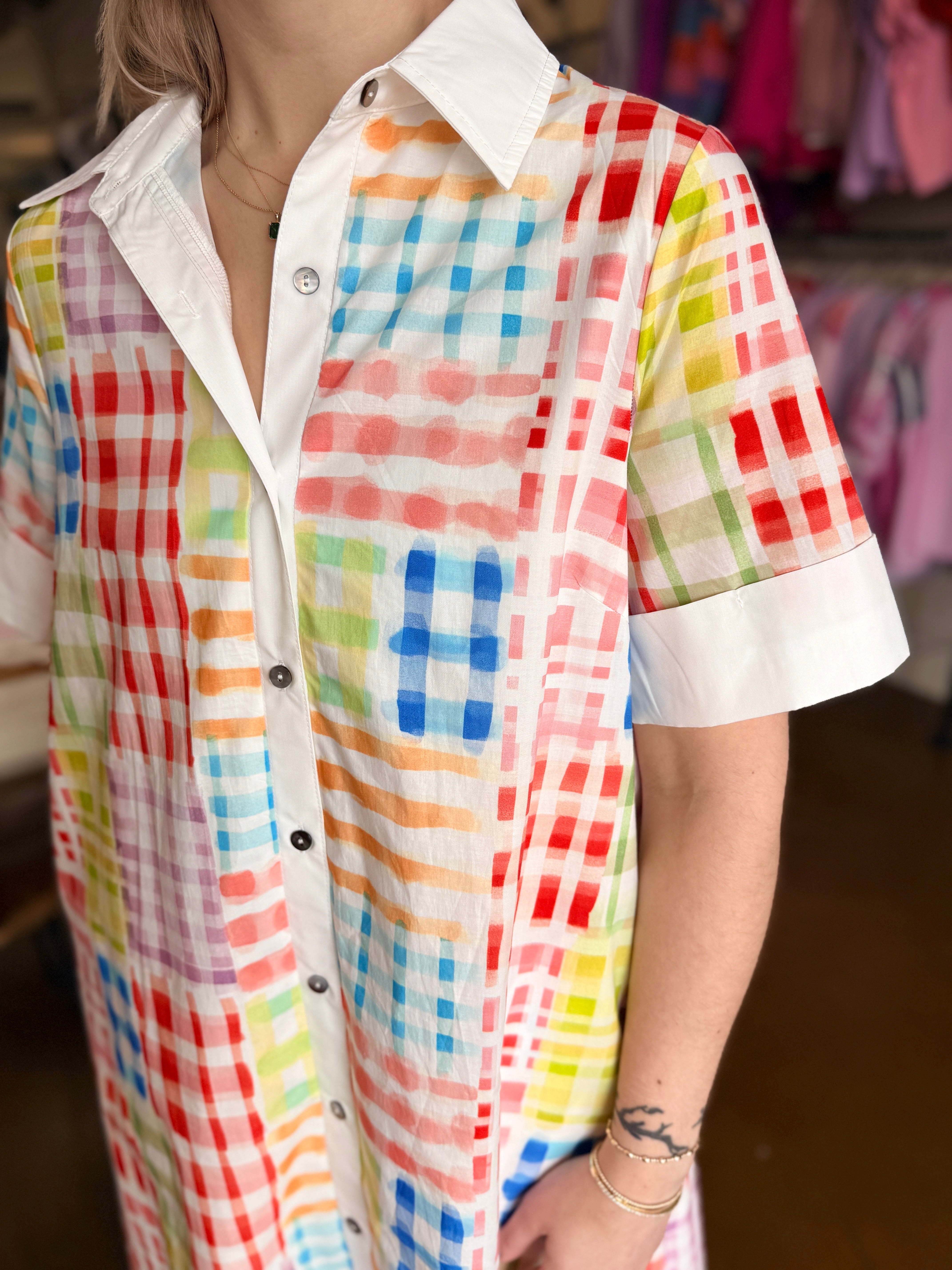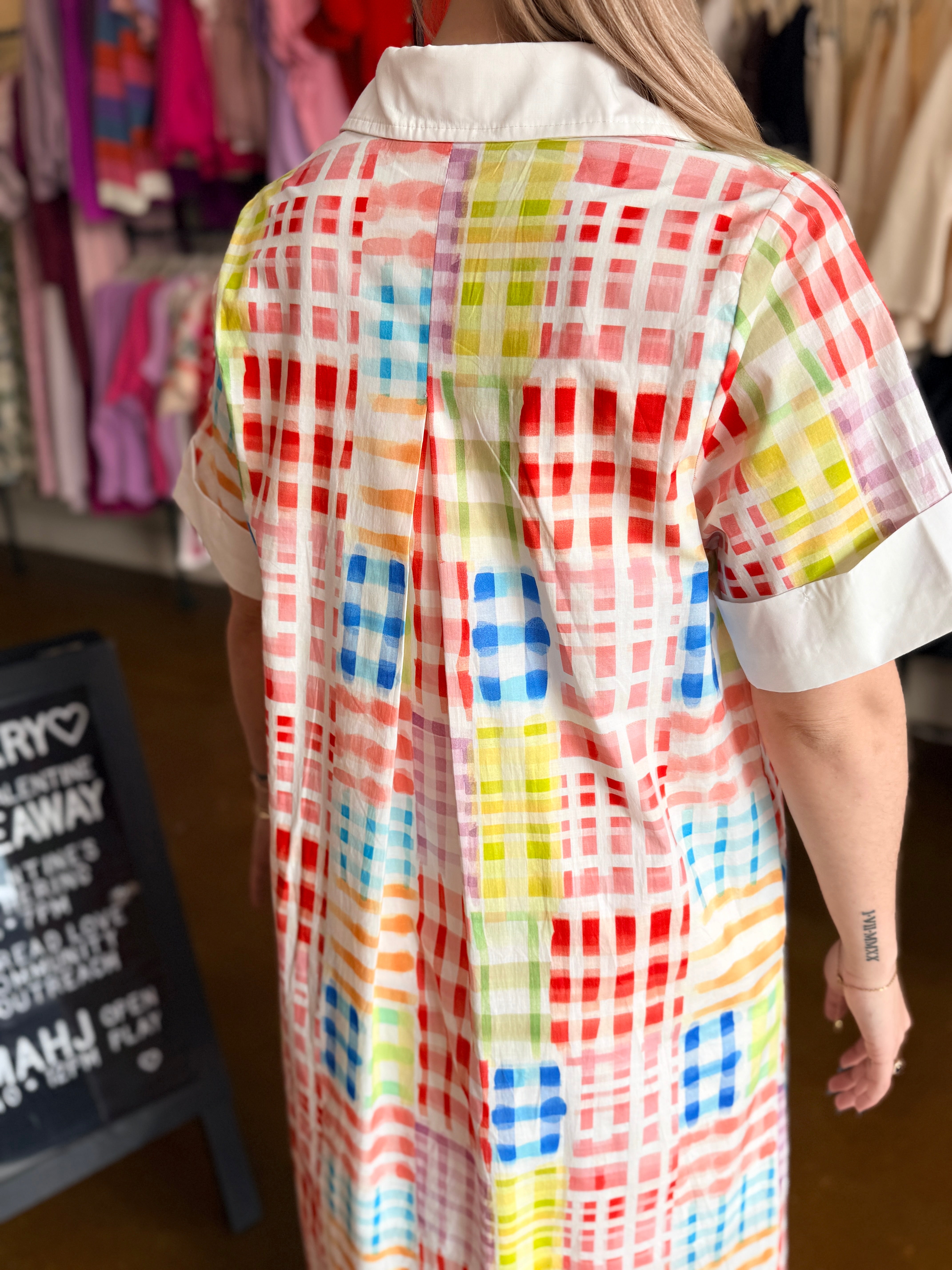 Plaid print short sleeve midi dress featuring collared neckline and button closure at front. Contrast trim at collar and sleeve cuffs. Lined. Woven. Non-sheer. Lightweight.