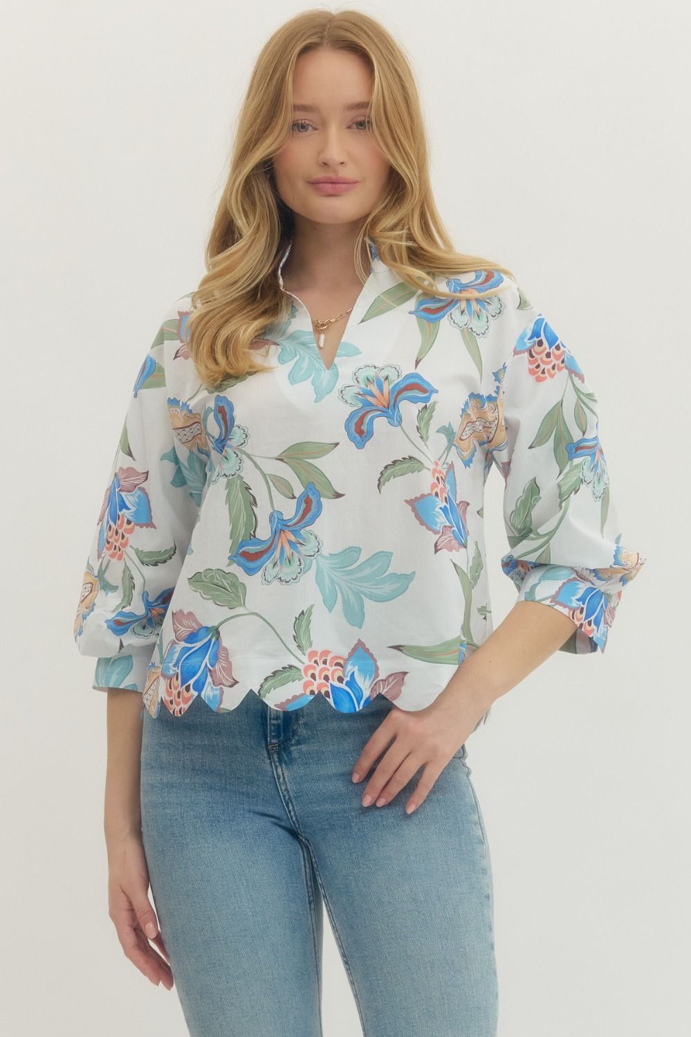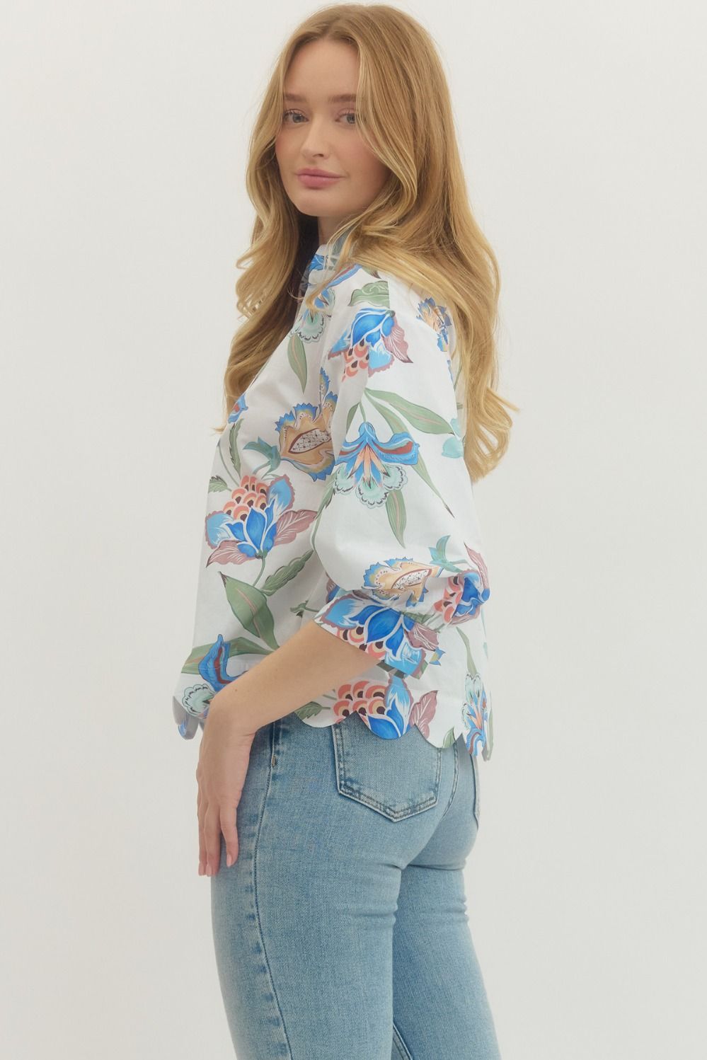 Floral print long sleeve top featuring scallop hem and V-neck band collar. Buttoned cuffs. Unlined. Woven. Non-sheer. Lightweight.