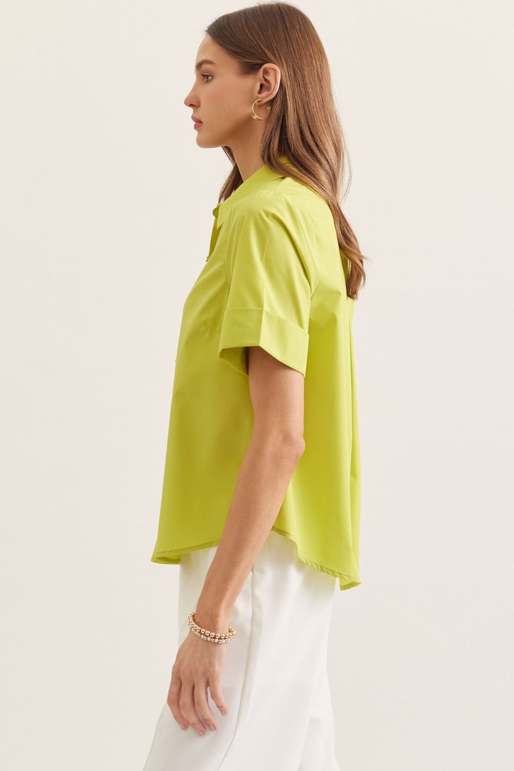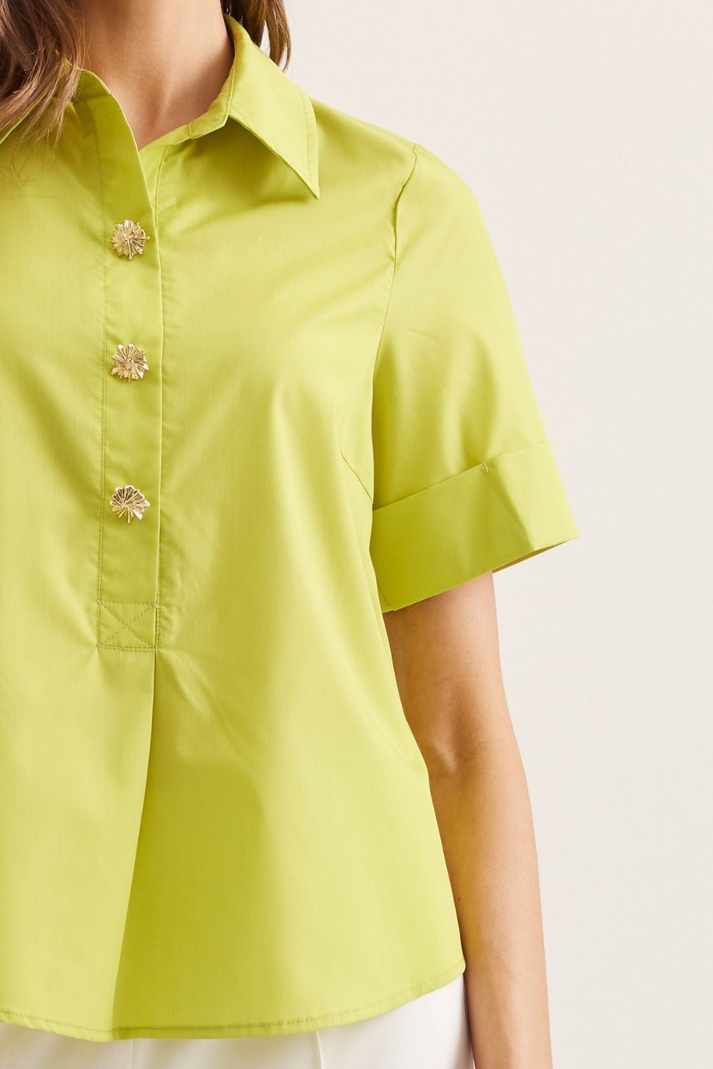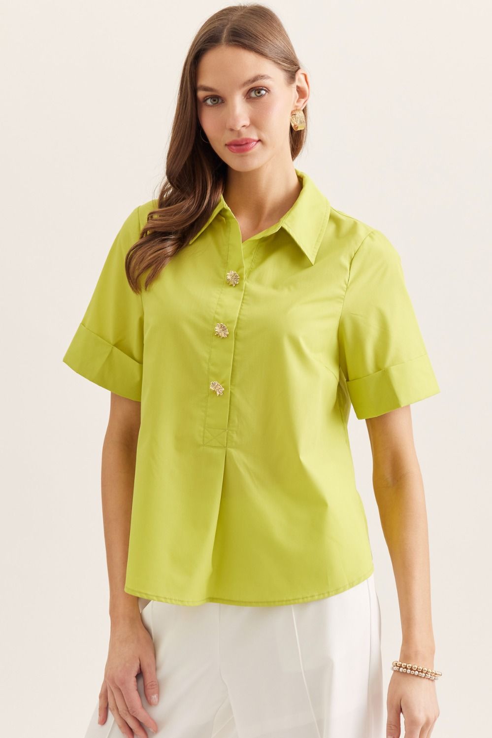 Solid short-sleeve top featuring front gold decorative button placket and collared neck. Back yoke with center inverted pleat detail. Unlined. Woven. Non-sheer. Lightweight.