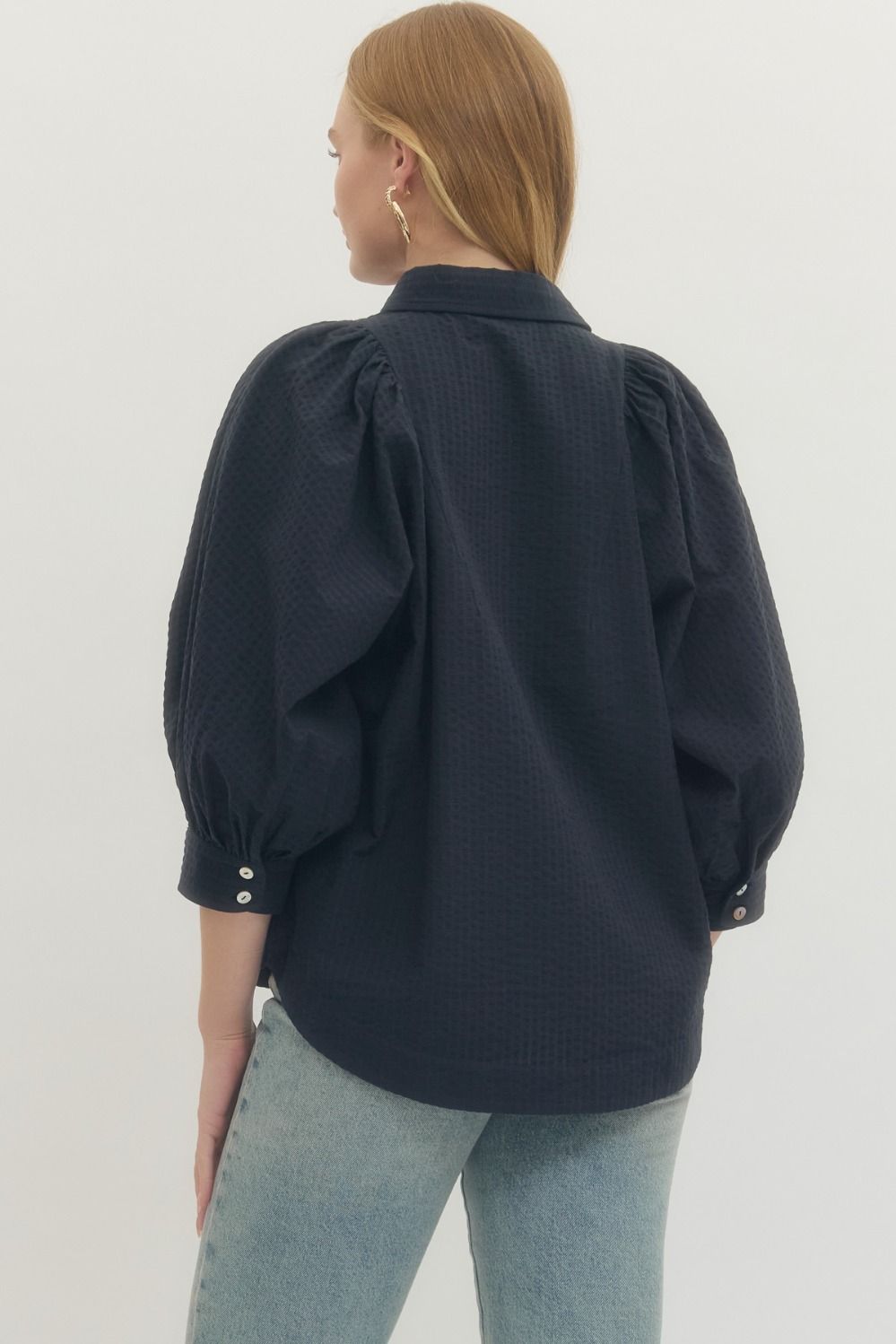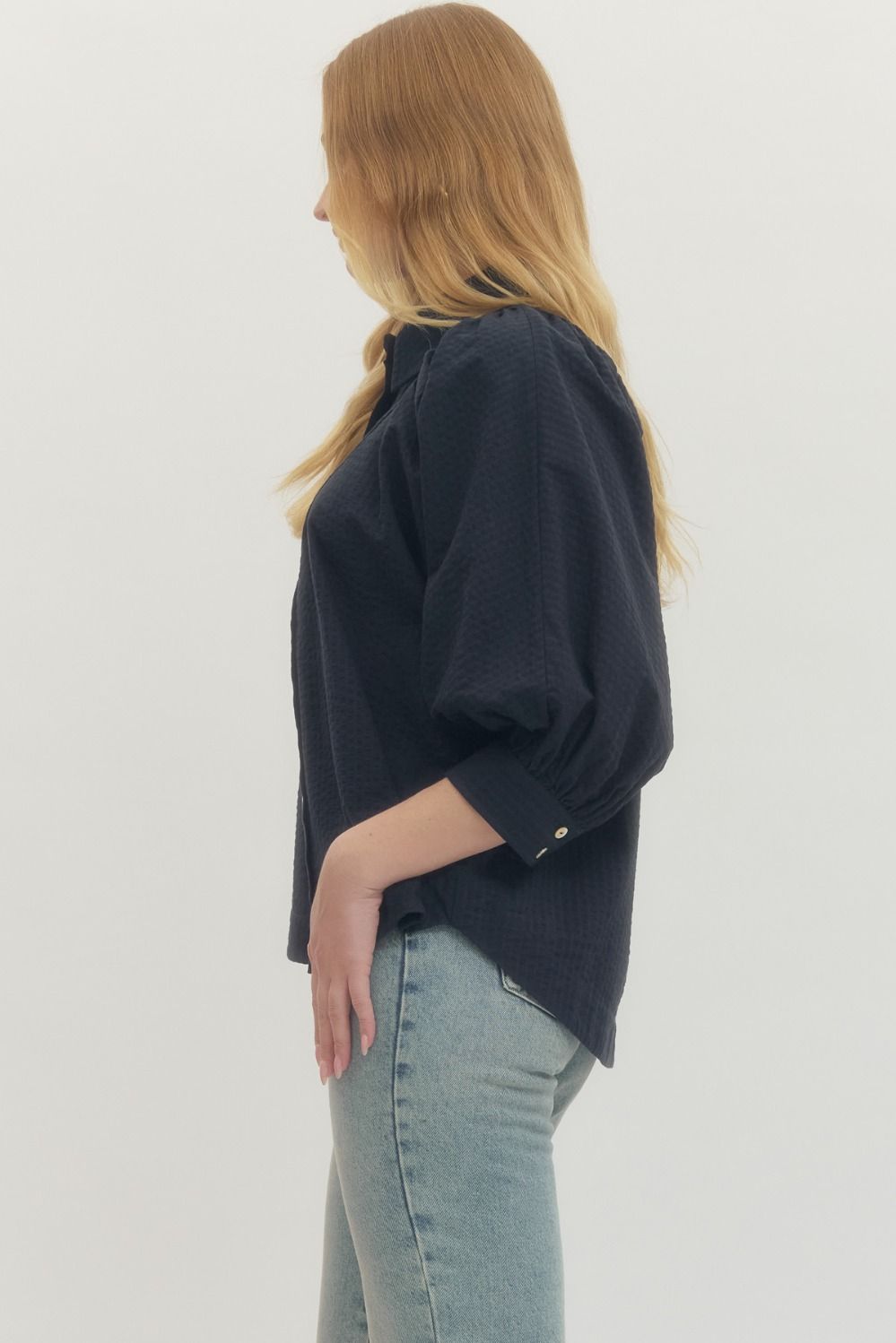Solid textured 3/4 sleeve top featuring button closure at front and puff sleeve with buttoned cuffs. Unlined. Woven. Non-sheer. Lightweight. NAVY.
