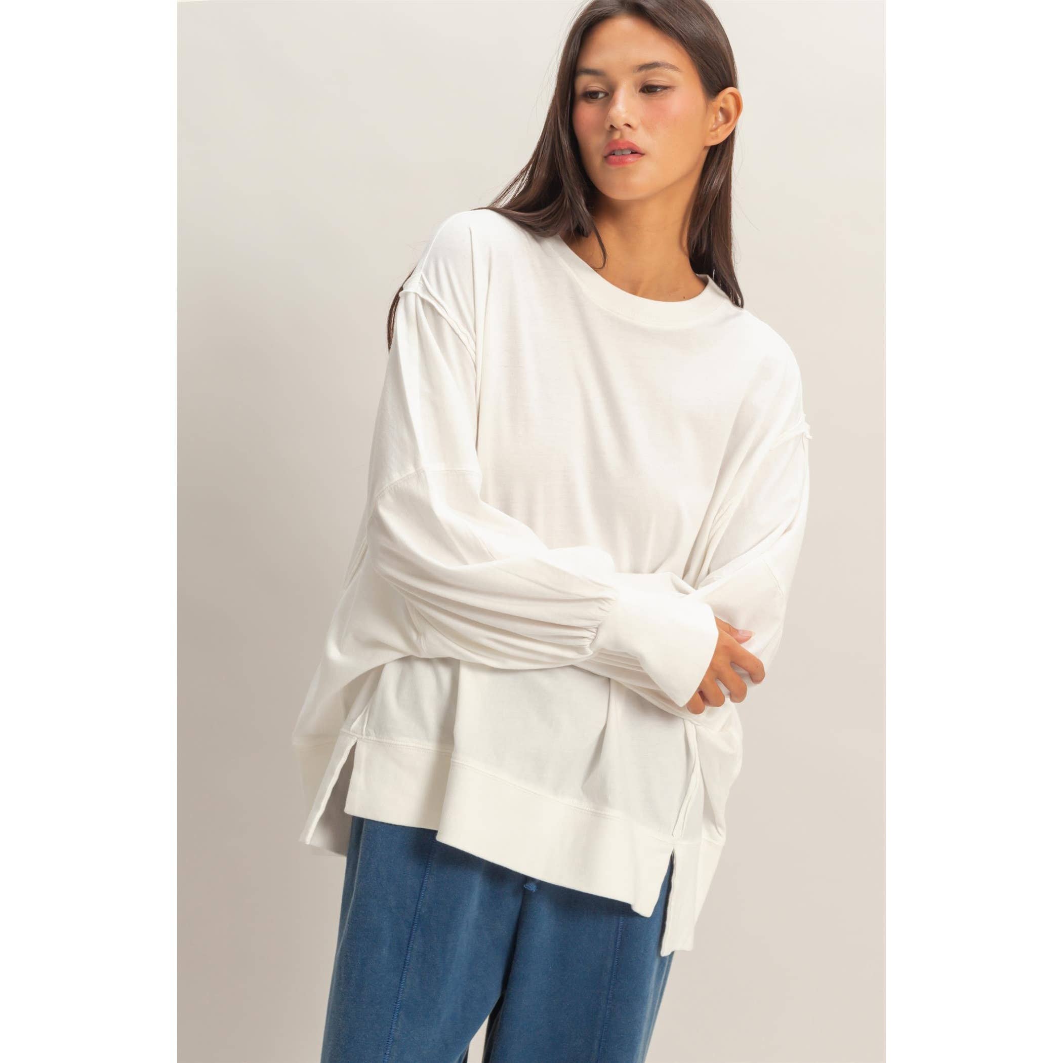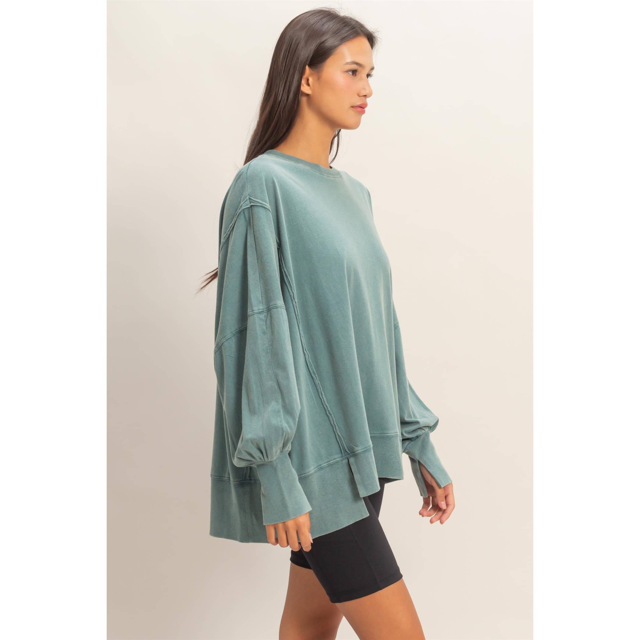 This sweatshirt is crafted from soft cotton with a vintage wash finish. The design includes a classic crew neckline and long sleeves with exposed reverse seam detailing on the side panels. The cut is an oversized fit with side slits.