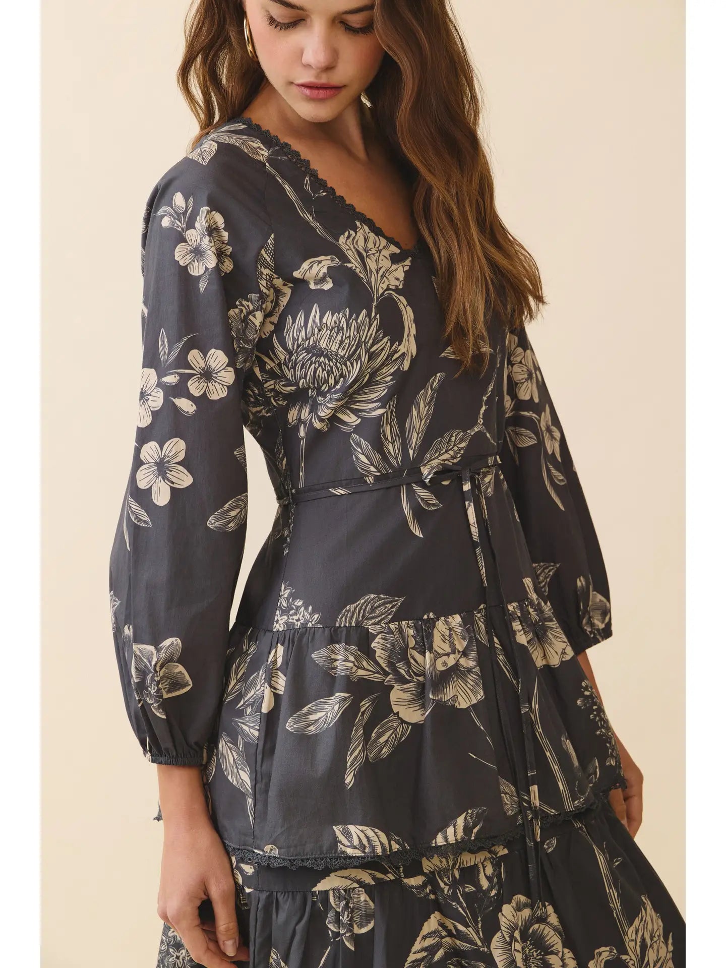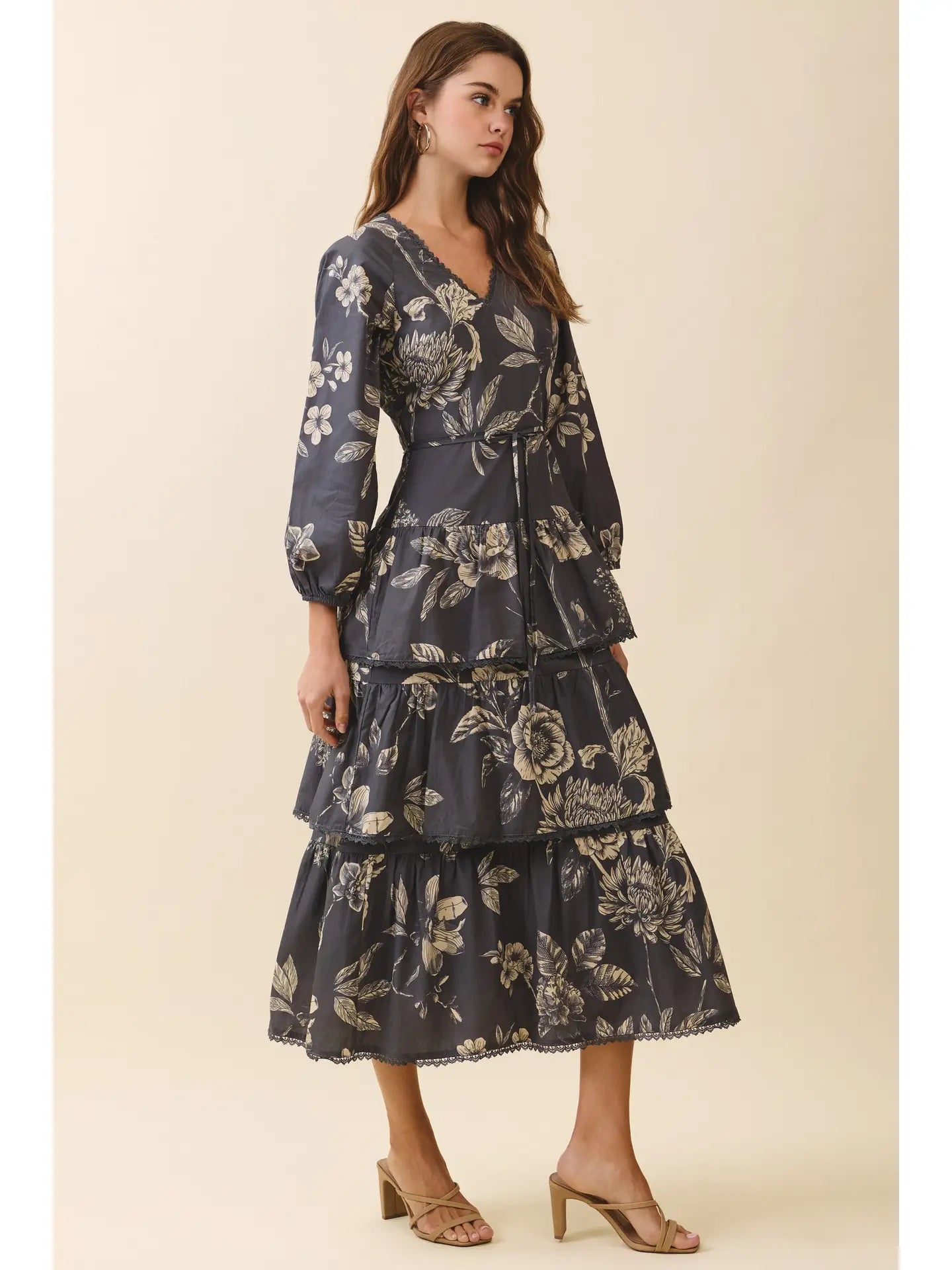 A floral tiered midi dress designed with a V-neckline trimmed in delicate lace. Featuring long puff sleeves with elastic cuffs and a self-tie waist that defines the shape. The voluminous tiered skirt adds graceful movement, while the back concealed zipper ensures a sleek fit.