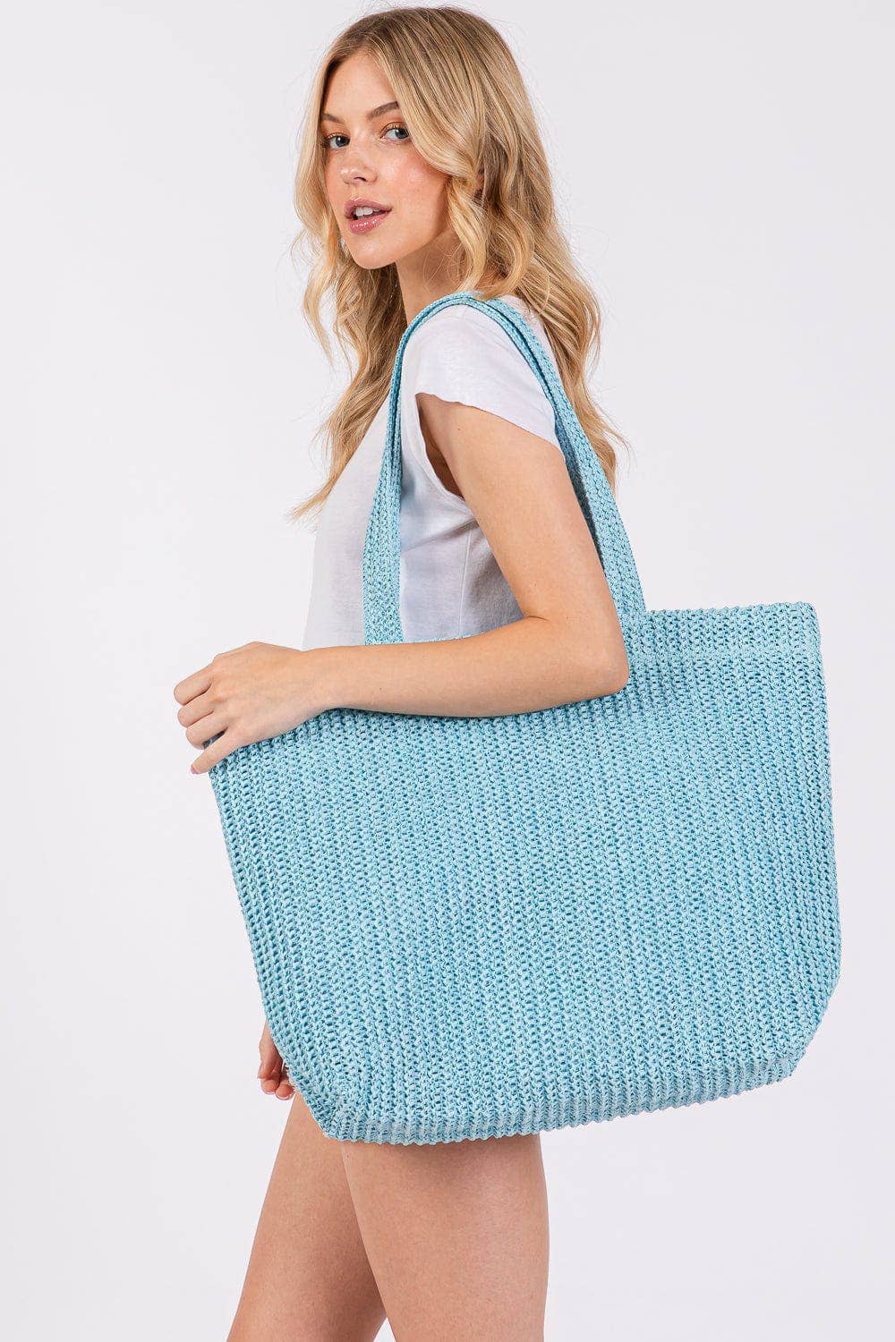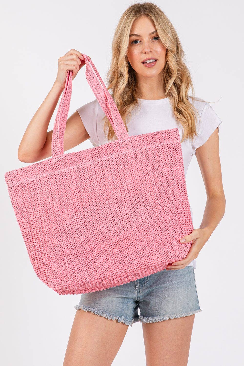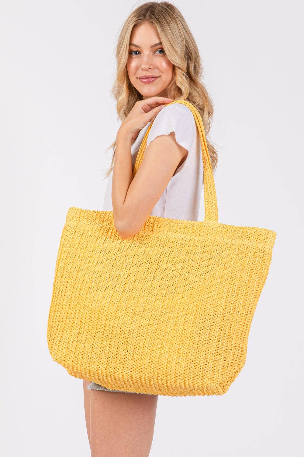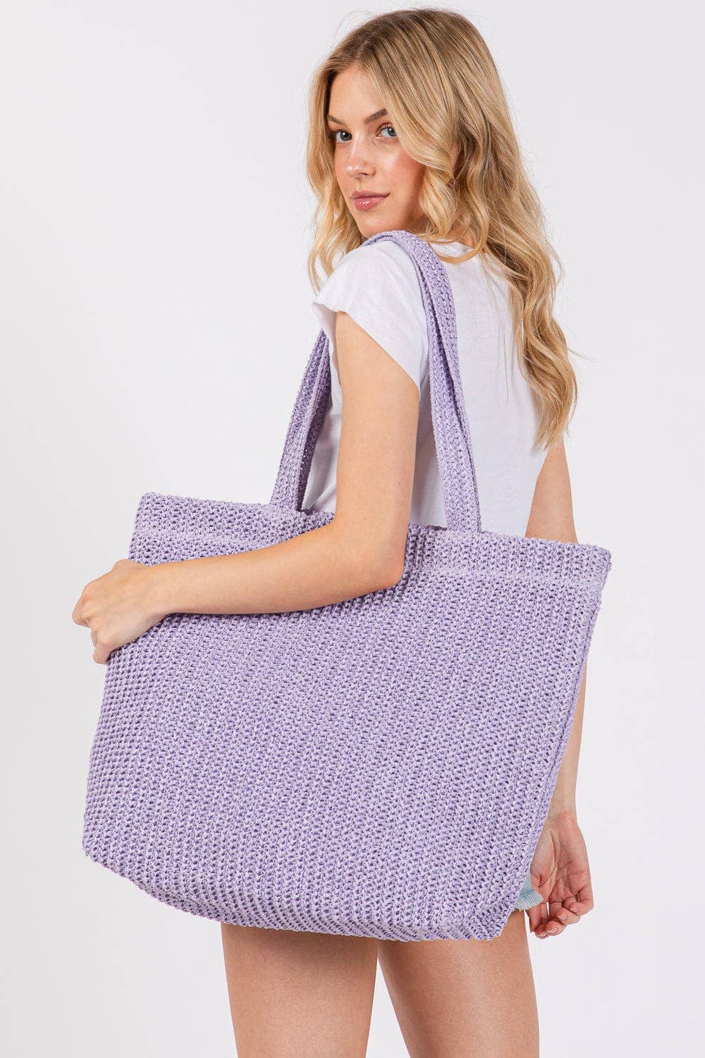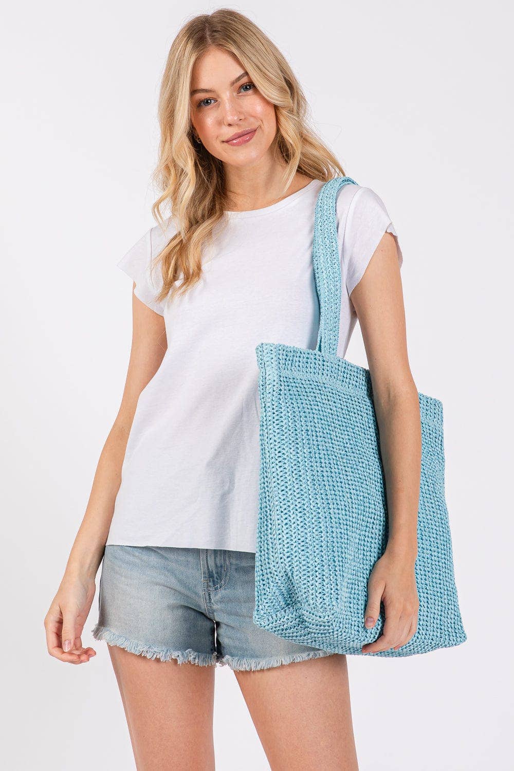 This solid crochet straw tote bag is a must-have for the summer! Lightweight and stylish, it's perfect for carrying all your essentials to the beach or a picnic. Don't settle for a plain bag, add some fun to your outfit with this playful tote.
