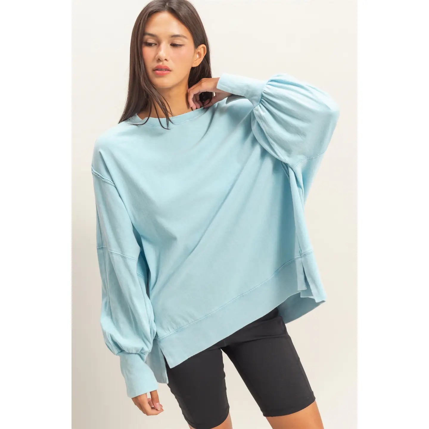 This sweatshirt is crafted from soft cotton with a vintage wash finish. The design includes a classic crew neckline and long sleeves with exposed reverse seam detailing on the side panels. The cut is an oversized fit with side slits.
