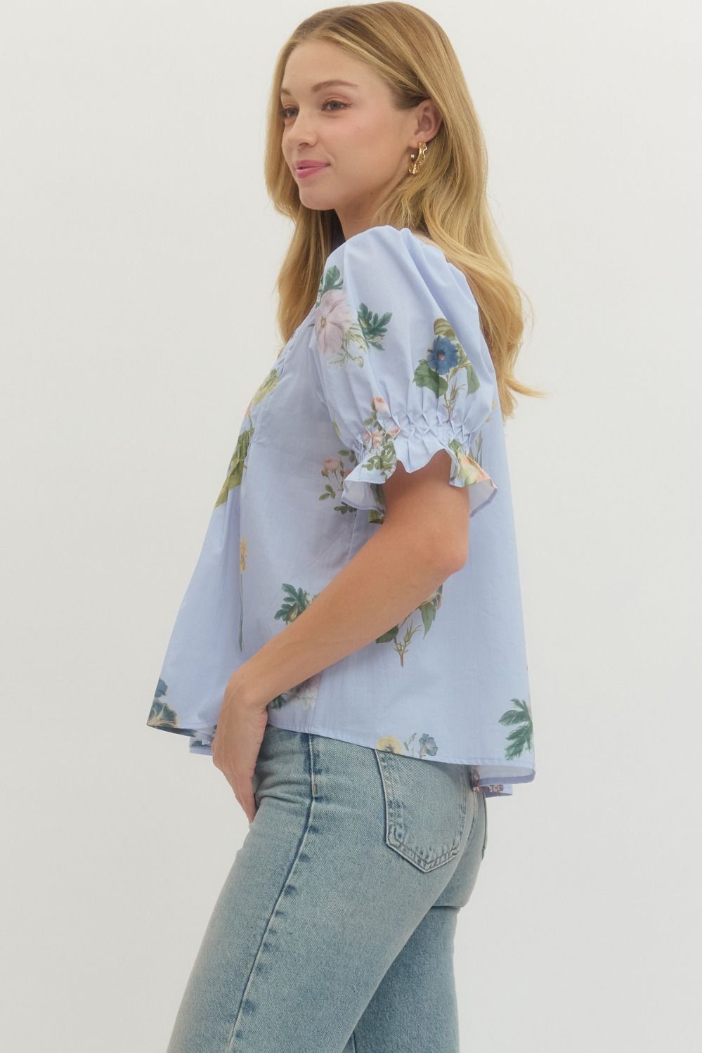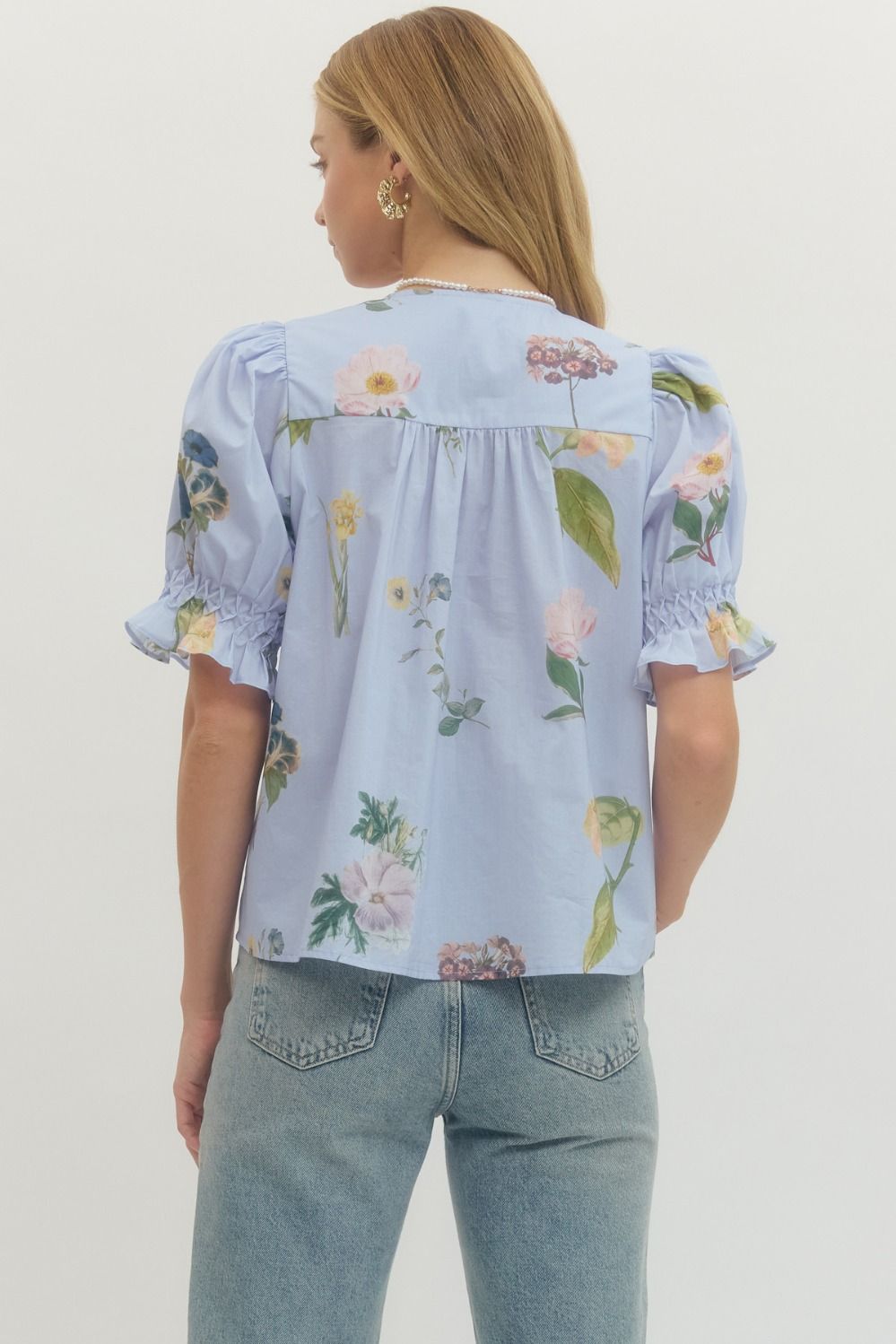 Floral print short puff sleeve blouse featuring pintuck and smocked detail at front. Button closure at front. Unlined. Woven. Non-sheer. Lightweight.