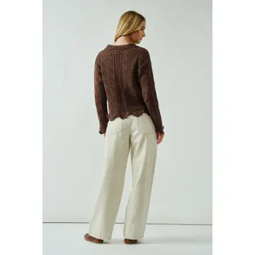This timeless open knit crochet cardigan, crafted in a delicate geometric pattern for a breezy, feminine feel. Featuring a scalloped hem, textured pom-pom button closures, and a soft collar.